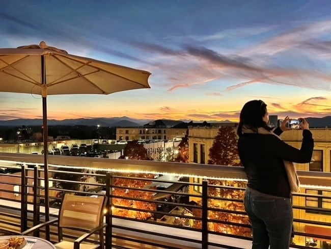 Sip cocktails and watch Blue Ridge Mountain sunsets from three rooftop bars with reserved seating