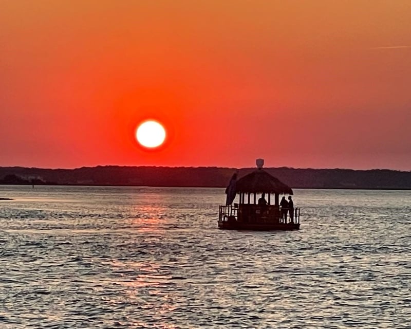 Relax on a BYOB tiki boat as captains guide you to the best Crystal Coast sunset views