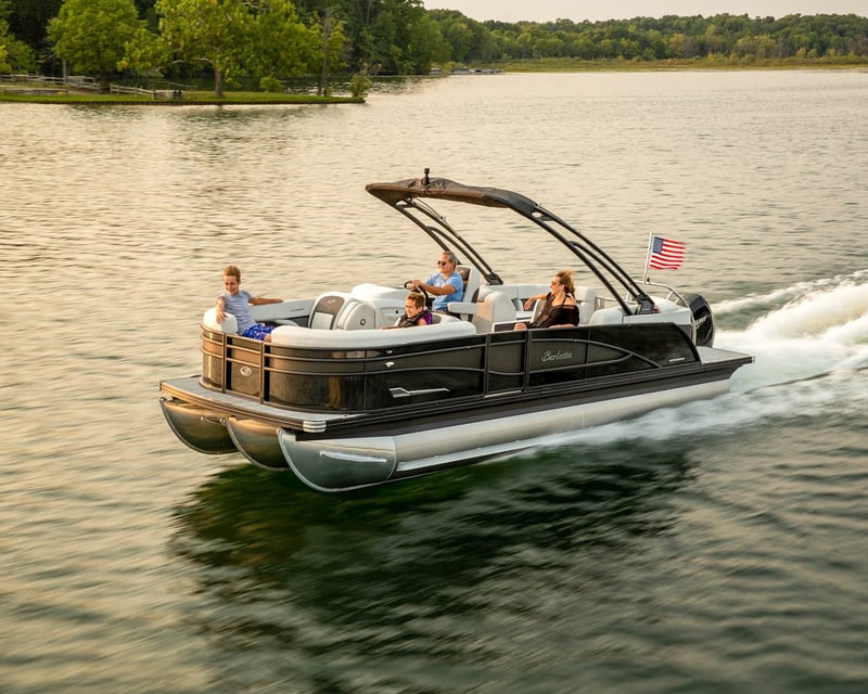 Rent a 2022 pontoon with Bluetooth, shade, and room for up to 13 for time on Lake Erie or the Cuyahoga River