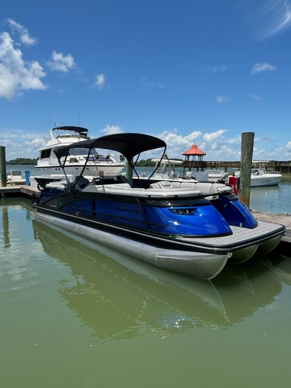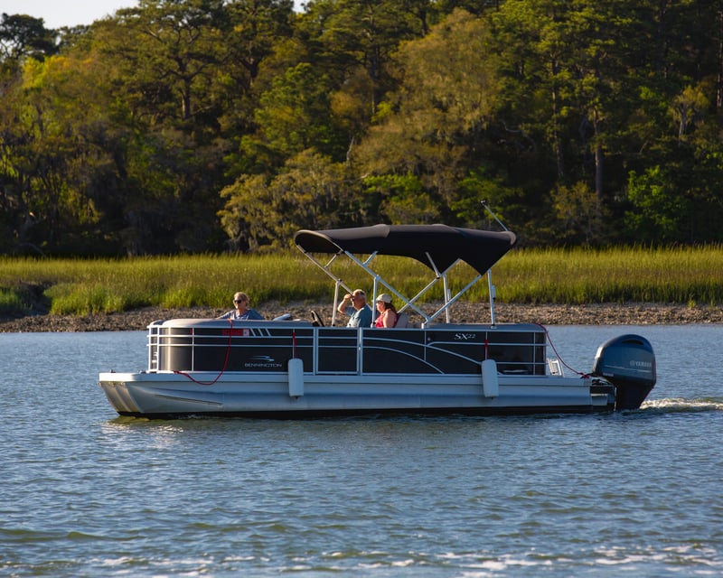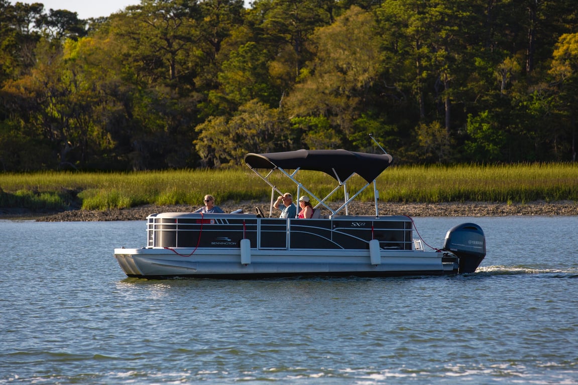 Cruise Hilton Head waterways aboard a 22-ft Bennington pontoon with GPS and Bluetooth stereo.