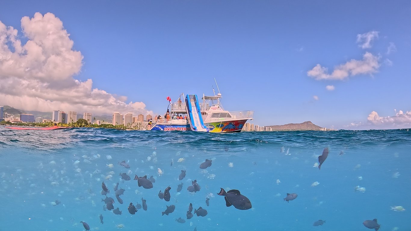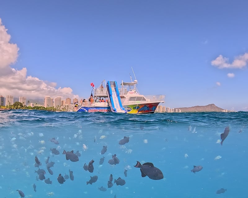 Living Ocean Tours delivers exactly what Hawaii snorkeling dreams are made of: sea turtles everywhere, colorful fish, and a genuinely attentive crew. First-timers consistently praise how the staff makes non-swimmers feel safe and comfortable in the water, with guides like Andres (who speaks Spanish) and Missy going above and beyond to share their knowledge about marine life. Families appreciate that it's alcohol-free, and kids love the bonus features like the slide and trampoline on board. The value here stands out. Everything you need is provided, and the crew's patience shines through whether you're teaching young children or reassuring adults who aren't confident swimmers. Several reviewers mention this being their best snorkeling experience in the area, which speaks volumes. Just note that parking isn't included, so arrive early to find a spot and walk over. The crew handles the rest, creating an experience that keeps people talking long after they've dried off.