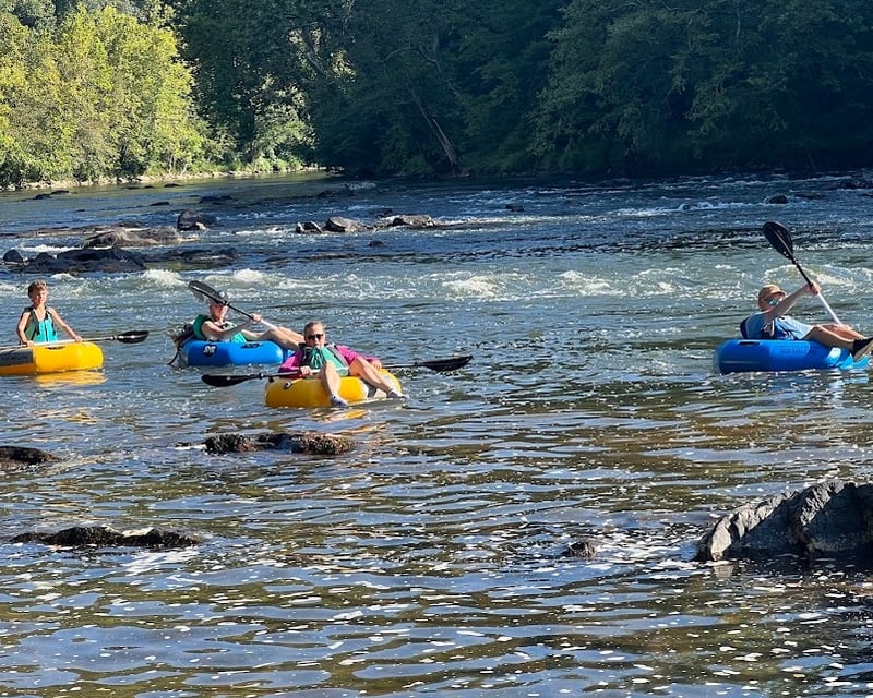 The owners, Jim and Lindsay, consistently earn praise for being incredibly welcoming, knowledgeable, and going above and beyond to ensure everyone has a safe, fun experience. Multiple reviewers mention their thorough safety briefings, helpful communication (even calling to check water conditions for families with kids), and quick problem-solving when issues arise. Their adorable dogs, Willie and Waylon, add an extra touch of charm and often paddle alongside groups. The operation feels personal and family-oriented, with guests repeatedly saying they were made to feel like family. The 5-mile tubing trip on the French Broad River strikes a perfect balance between excitement and relaxation, with some rapids mixed into a scenic float. Reviewers appreciate the quality equipment, complimentary photos and videos, and how smoothly everything runs from start to finish. Groups of all sizes, from couples to 22 people, report having a blast, and families with young children feel especially well taken care of. Located near Marshall, NC (about an hour from Pigeon Forge and close to Asheville), this outfit handles both last-minute drop-ins and reservations, though calling ahead is recommended.