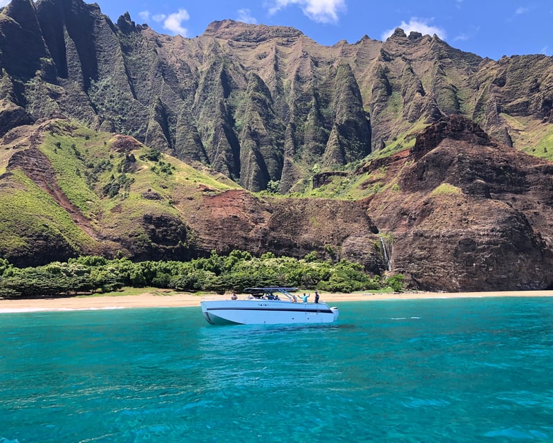 Ride a small-group power catamaran for sea caves and Na Pali scenery in vibrant afternoon light