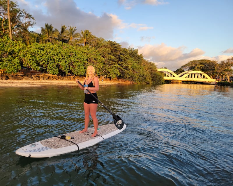 Julie creates something truly special on the calm river waters beneath Haleiwa's Rainbow Bridge. Her SUP yoga classes and turtle tours have become must-do experiences on Oahu's North Shore, with guests consistently praising her warmth, skill, and genuine passion for what she does. She's described as an excellent instructor who makes first-timers feel completely comfortable, whether they're new to paddleboarding, yoga, or both. The setting itself is stunning, and Julie enhances it with thoughtful touches like singing bowl sound baths during evening paddles and LED-lit boards that illuminate the water at night. The sea turtles are the other stars of the show. Guests regularly spot dozens swimming beneath their boards, and Julie's knowledge of the river and its wildlife adds depth to every outing. She handles all the details beautifully, providing waterproof pouches for phones and taking excellent photos throughout so you can stay present in the moment. Multiple reviewers mention returning for a second experience, and families particularly appreciate how accessible and magical she makes these adventures. The river's calm conditions make it perfect for beginners, while Julie's sequenced yoga classes challenge more experienced practitioners.
