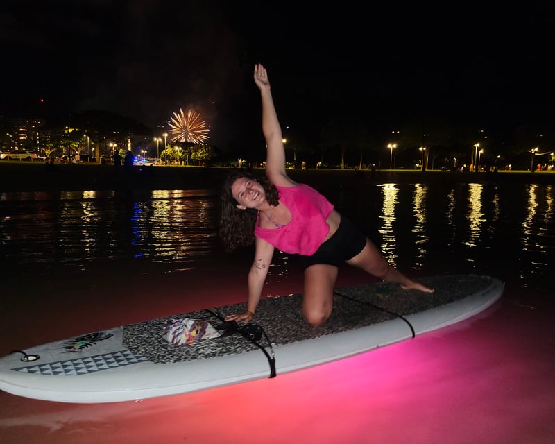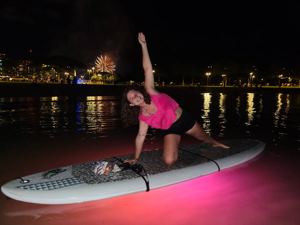 Paddleboard yoga on the ocean sounds intimidating, but most first-timers here found it surprisingly doable and genuinely magical. The instructors really seem to make the experience – names like Kelsey, Allie, Sariah, and Lety come up repeatedly for being attentive, encouraging, and skilled at working with everyone from total beginners to experienced yogis. They'll guide you through getting comfortable on the board before moving into poses, and they're great about modifications and meeting people where they are. Expect dreamy moments like doing downward dog while gazing at the water's surface, dipping your hands and feet in to cool off, and maybe even spotting a sea turtle swimming beneath you. The setting at Magic Island offers gorgeous mountain and ocean views, and if you time it right, you might catch Friday night fireworks or a stunning sunrise. There's one notable complaint worth mentioning: a visitor had a frustrating experience with a Friday evening instructor in August 2025 who seemed unprepared (not enough anchors for all the boards), had a negative attitude from the start, and mishandled the photo add-on situation in a way that felt dismissive and unprofessional. That stood out as an outlier in an otherwise overwhelmingly positive collection of feedback. Speaking of photos, the $10 add-on gets mentioned as totally worth it. Most people describe this as a highlight of their Hawaii trip – challenging enough to feel like an accomplishment but relaxing enough to melt away travel stress. It's particularly popular with honeymooners and those looking for something uniquely Hawaiian beyond the usual beach day.