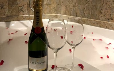 Celebrate newlywed bliss with our Deluxe Honeymoon add-on, thoughtfully curated to set the tone for romance and relaxation. Faux petals elegantly surround the bed or tub, while a romantic candle-lit setup creates an intimate atmosphere. Enjoy a chilled beverage of your choice, a beautifully arranged charcuterie board, and a box of locally sourced chocolates. A fresh floral bouquet and a personalized welcome card with the couple’s names complete this unforgettable honeymoon experience.