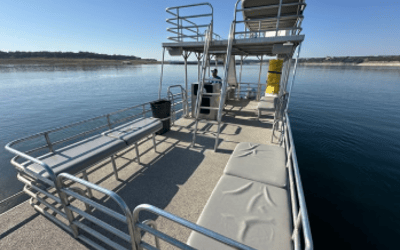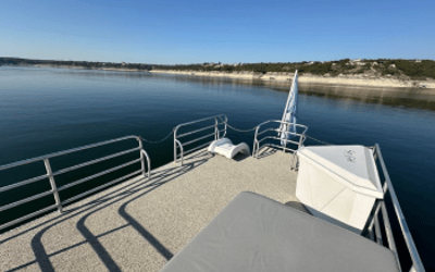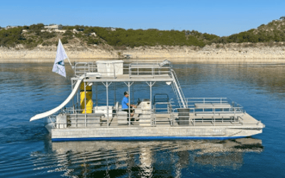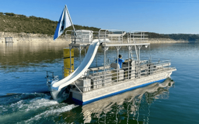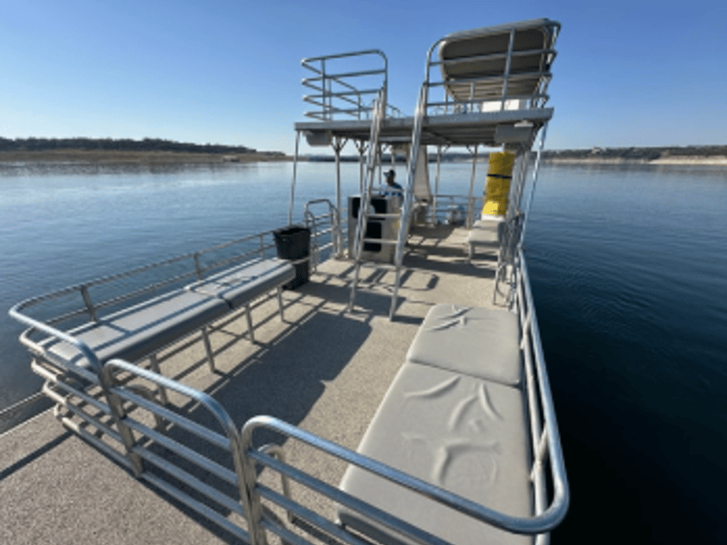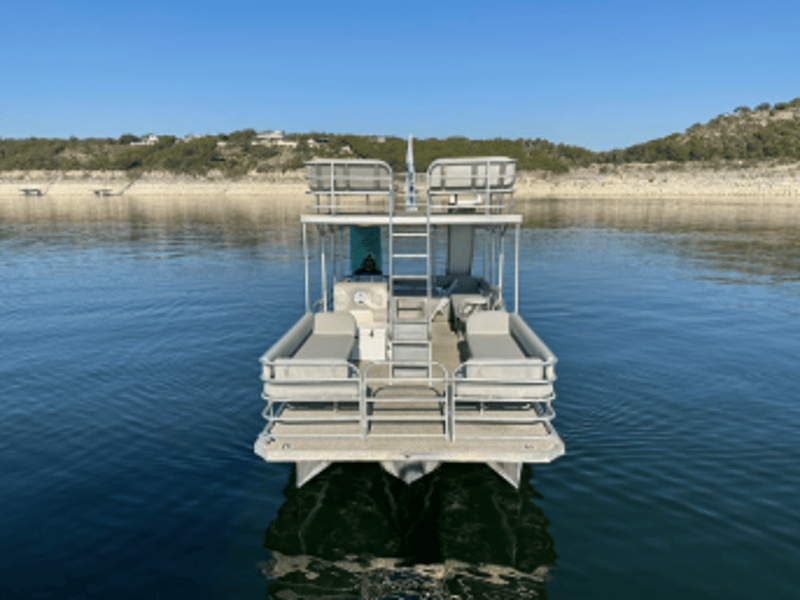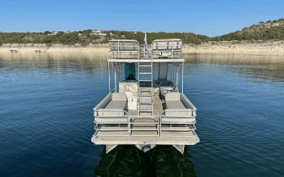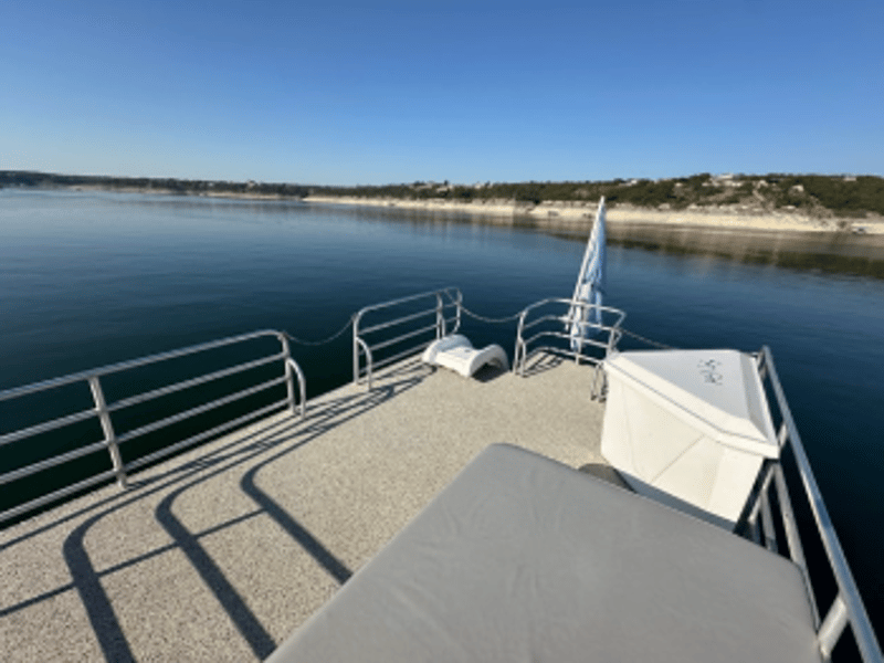Gather your crew for a captain-led double decker boat charter on Lake Travis. Enjoy the slide, upper deck lounges, and a floating mat while your music plays through the Bluetooth sound system.