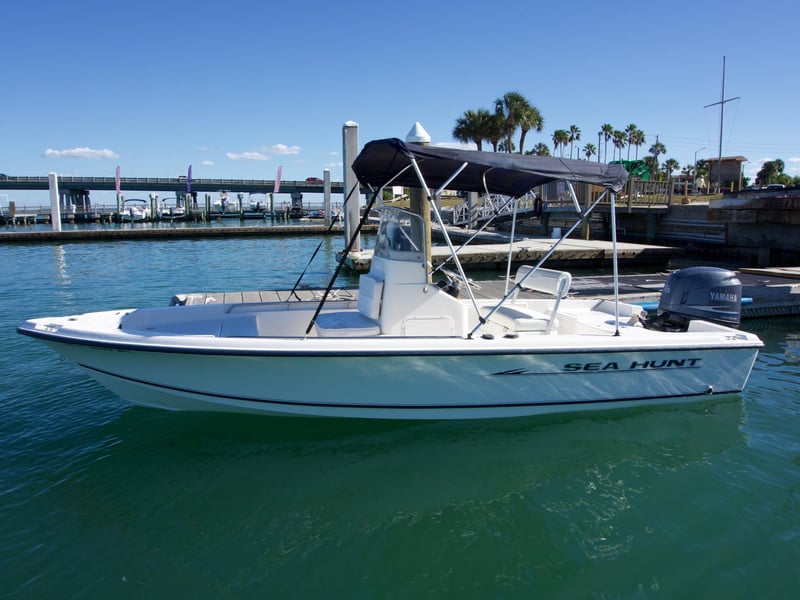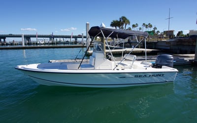 Rent an 18' SeaHunt Bay Boat in St. Petersburg for island hopping or flats fishing. Cruise up to 40 mph with a depth finder, Chart Plotter, and a Bimini Top for shade.