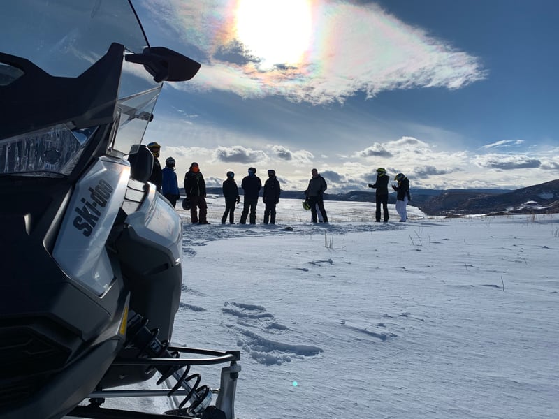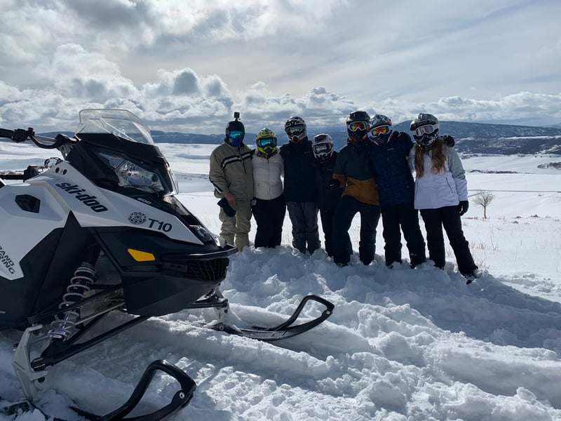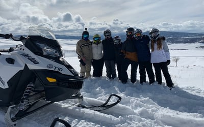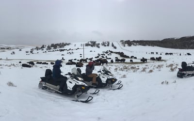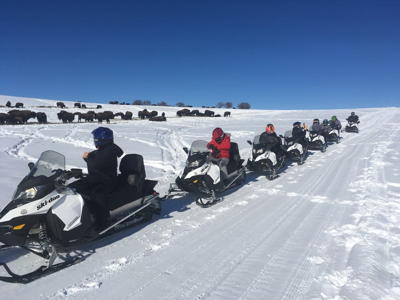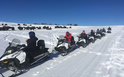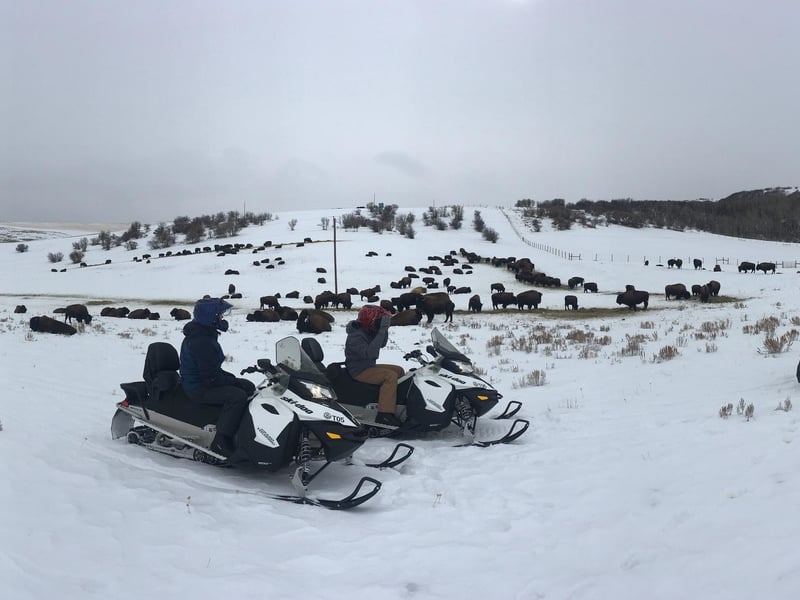 Ride 2-seater Ski-Doo snowmobiles on groomed trails around a bison ranch near Steamboat Springs. Enjoy panoramic views, varied terrain, and guaranteed bison sightings on a family-friendly guided tour.