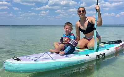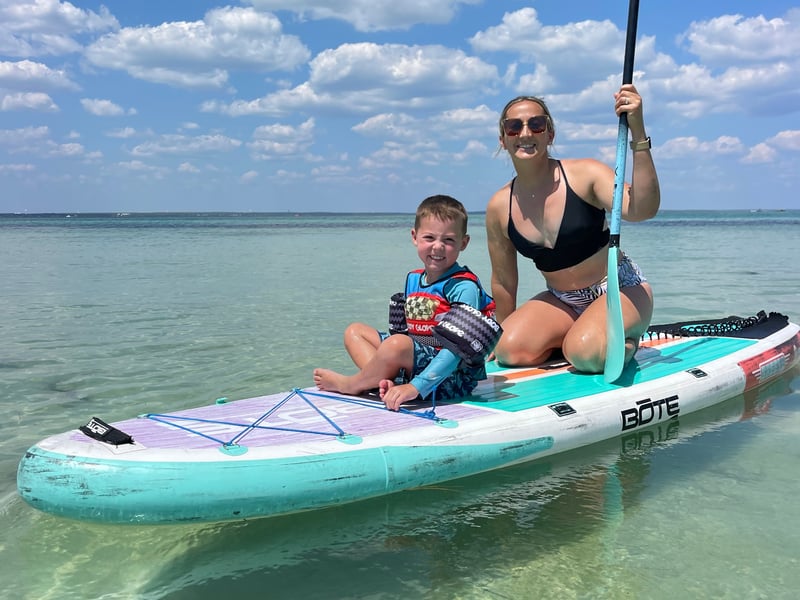 Paddleboard, snorkel, and search for dolphins on a captained pontoon with onboard restroom and water toys