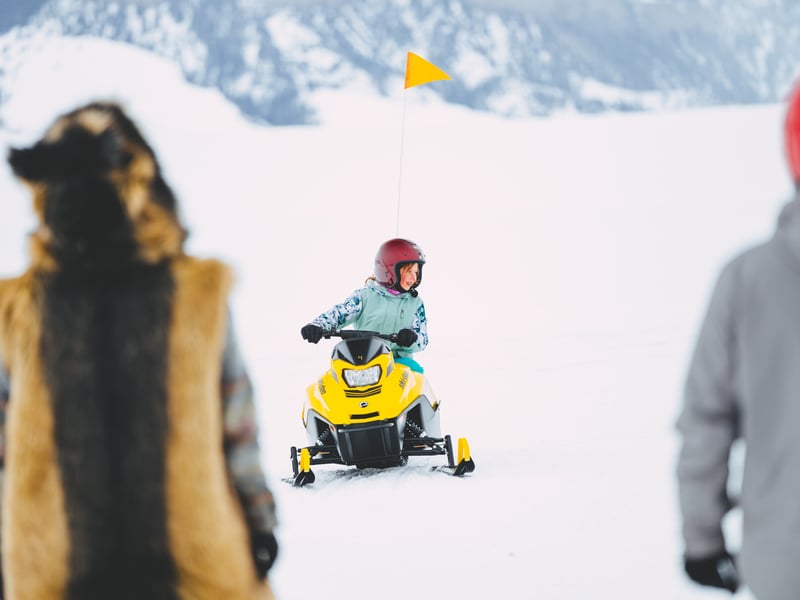 Drivers must be at least 18 with a valid driver's license or learner's permit; 18+ with a license is required to carry a passenger. Passengers must sit behind the driver and hold on; minors must be with their legal guardian; participants must be able to read and speak English. Double snowmobiles have a 425 lb combined max; three seaters have a 600 lb max and allow only one rider under 13.