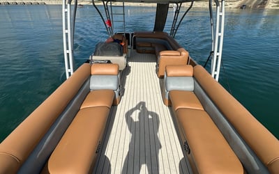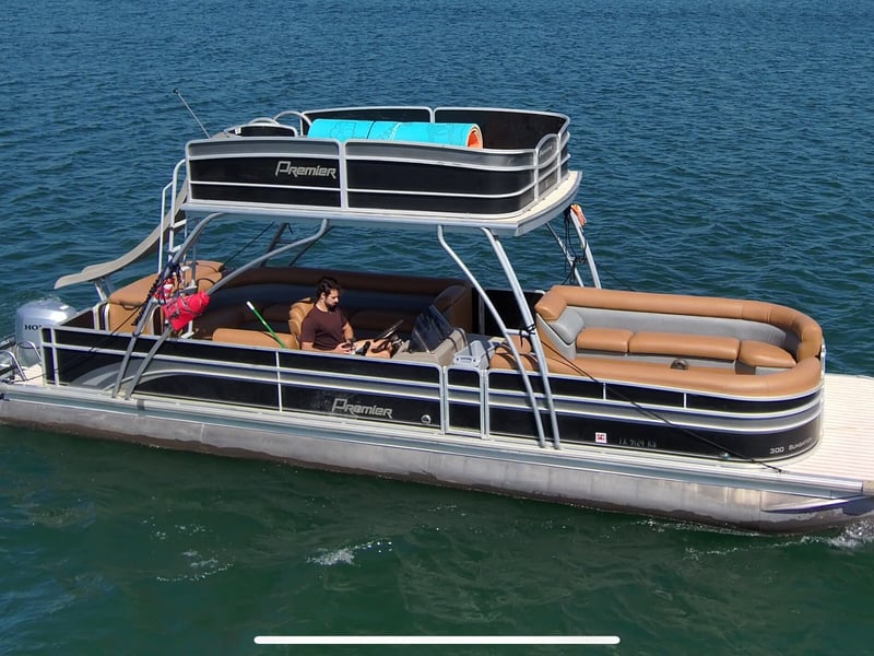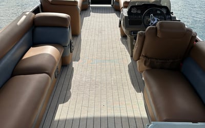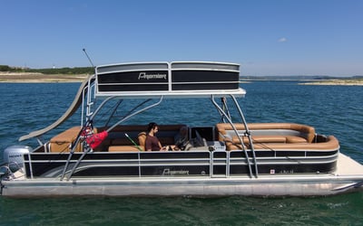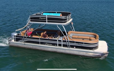 Enjoy a spacious 30' double-decker tritoon on Lake Travis with a captain at the helm. Relax, play on the slide, and cruise coves with included floats, cooler, and premium stereo.