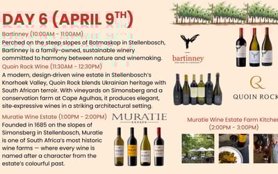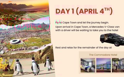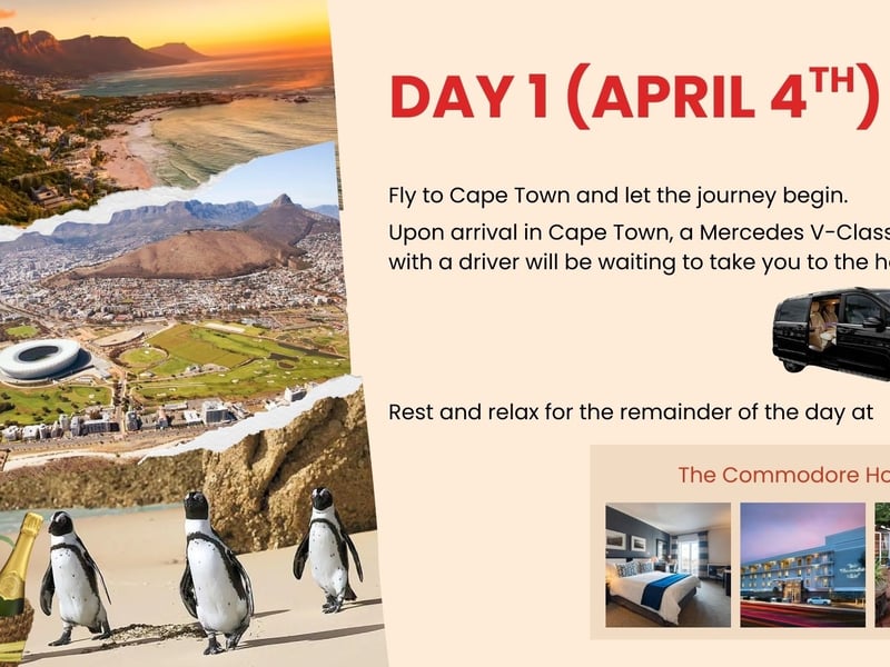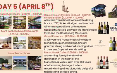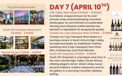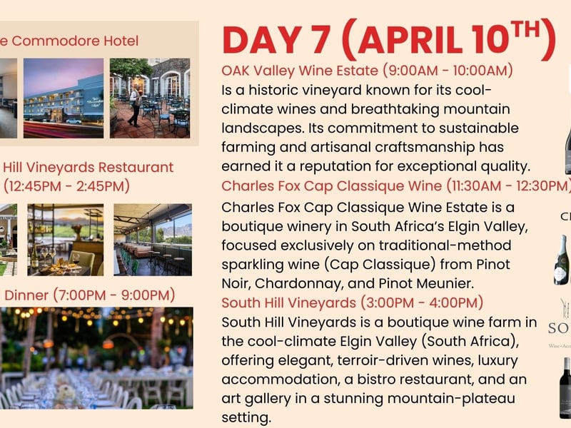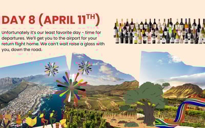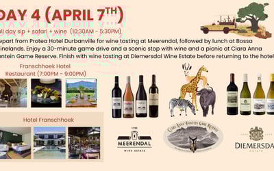 Immerse yourself in the South African Cape Winelands on an eight-day journey. Enjoy private transfers, chauffeured Mercedes vans, tastings at historic estates, the Franschhoek Wine Tram, a sip + safari + wine day, and a festive farewell dinner.