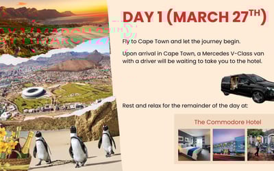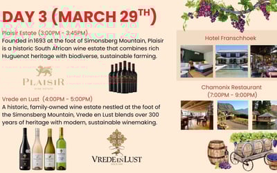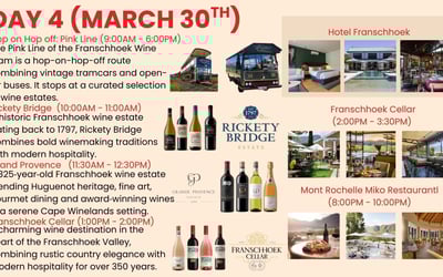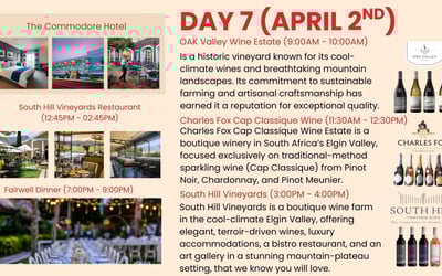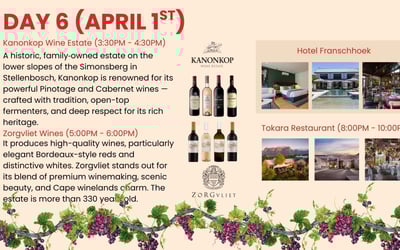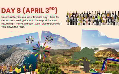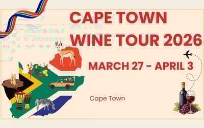 Discover South Africa’s Cape Winelands on an 8-day luxury journey. Enjoy private transfers, chauffeured transport, tastings at storied estates, a sip + safari + wine day, and a festive farewell dinner.