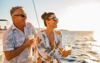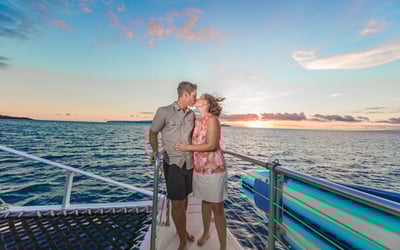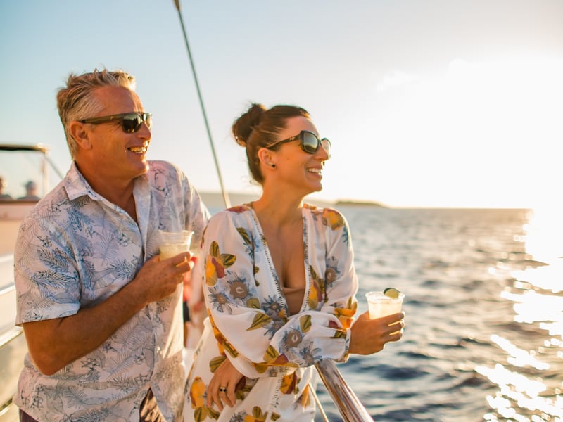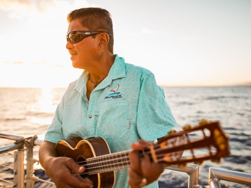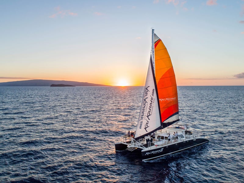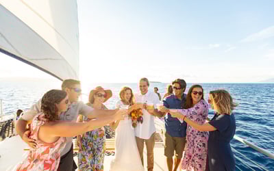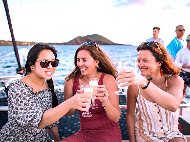 Sail South Maui at golden hour with live music, open bar, and a sparkling wine toast