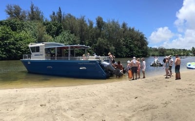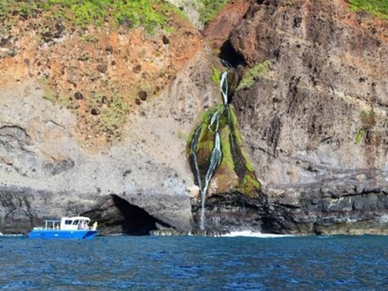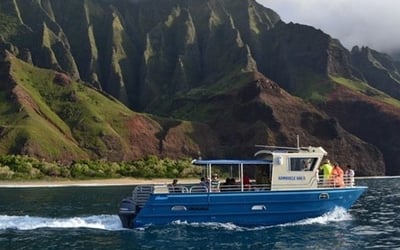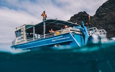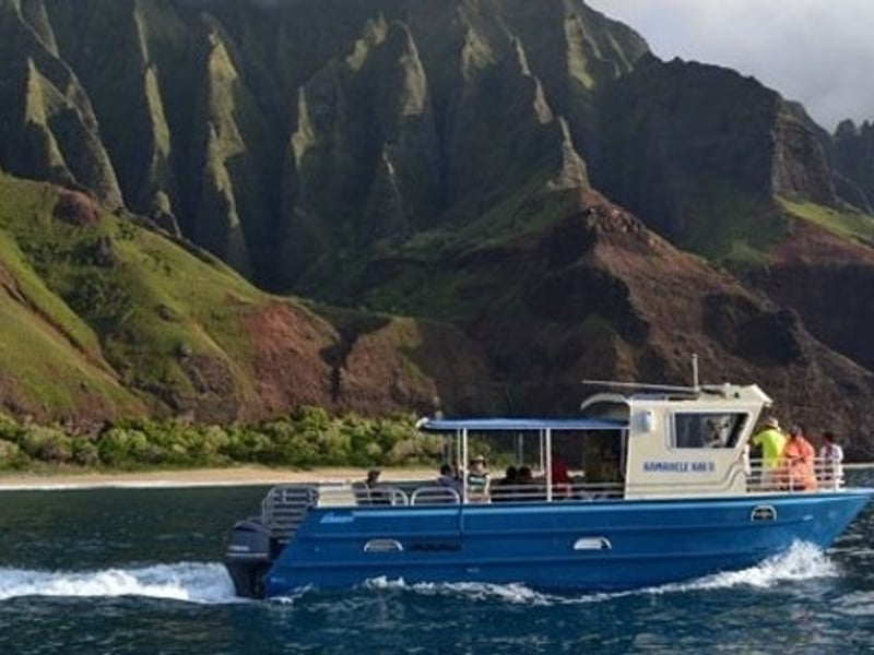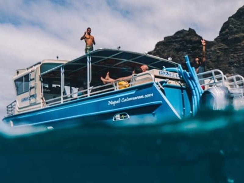 Cruise the Nā Pali Coast in the afternoon light from Hanalei Bay. Explore sea caves, valleys and beaches, watch for wildlife, and snorkel when conditions allow.