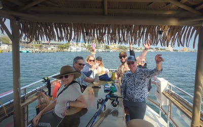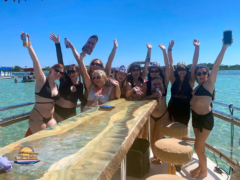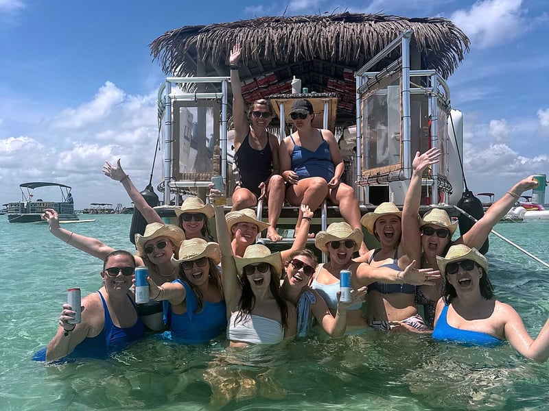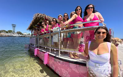 Cruise on a private tiki boat to Crab Island, swim and relax with included water, ice, floats, and paddle board