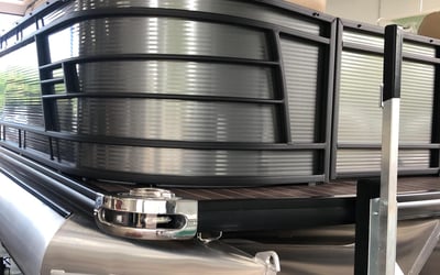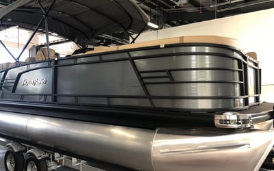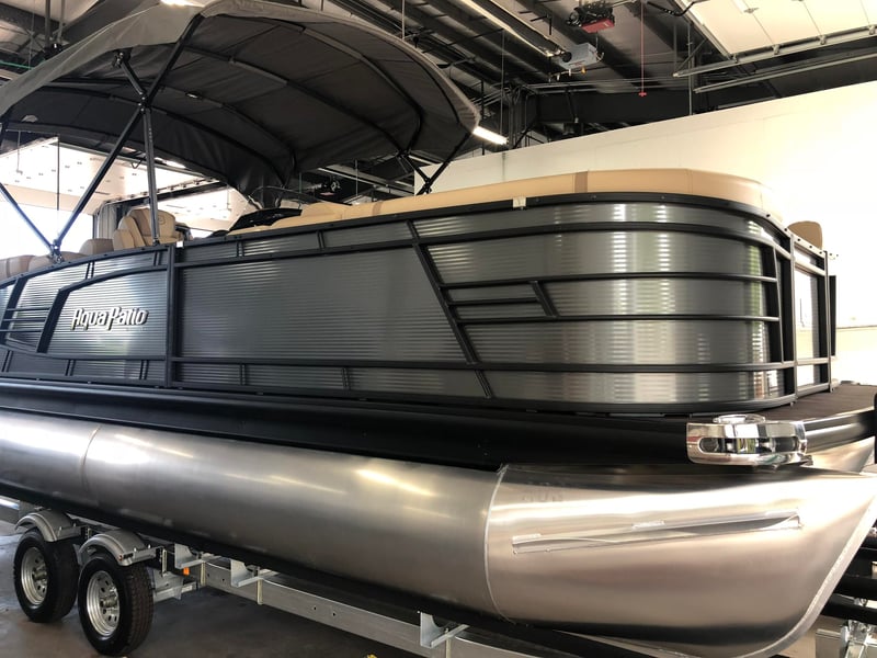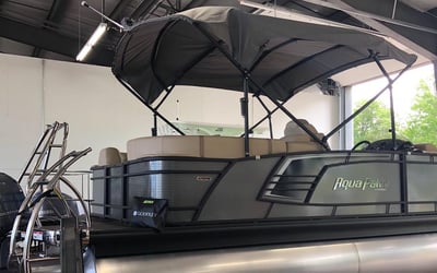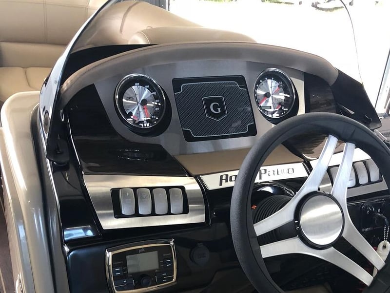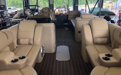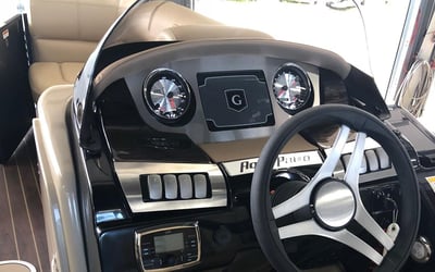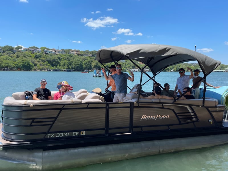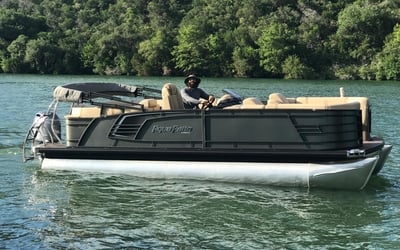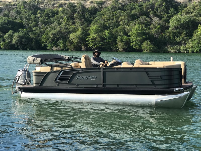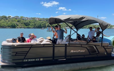 Cruise Lake Austin aboard a 24' Aqua Patio 235SB tritoon powered by a 150 HP Yamaha. Relax with spacious seating, ample shade, and a quality Bluetooth sound system for a fun day on the water.