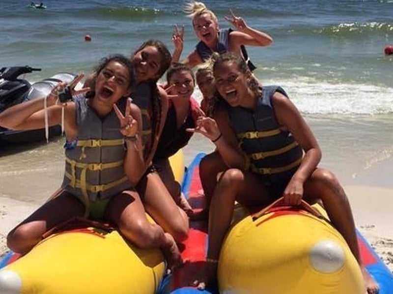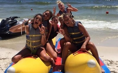 Hold tight as you bounce across Gulf waves on an inflatable banana boat pulled by jet skis