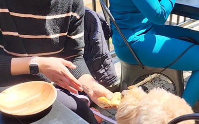We sit on dog-friendly patios with water bowls provided. Dogs are not brought inside restaurants.