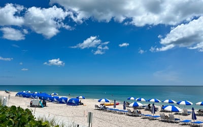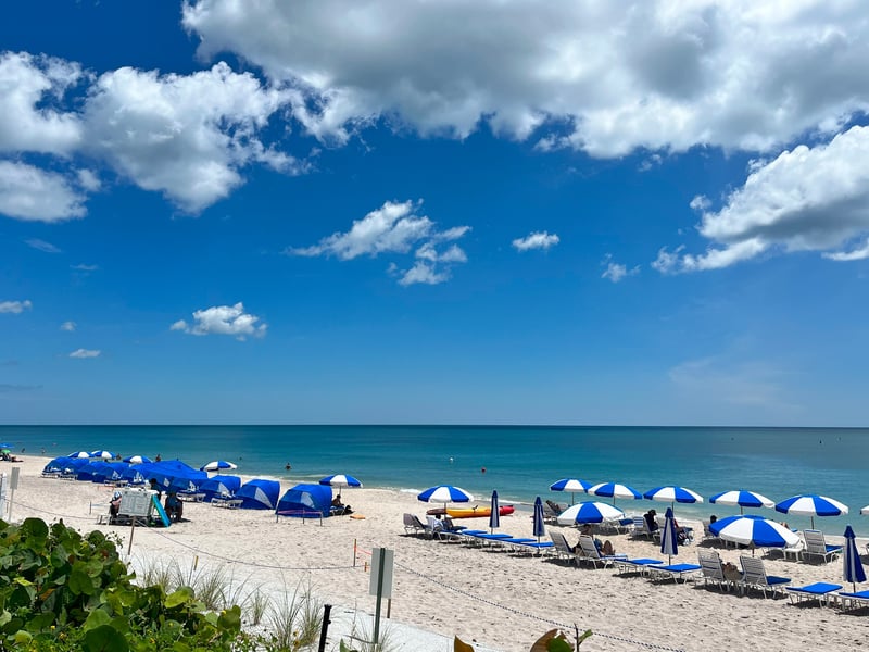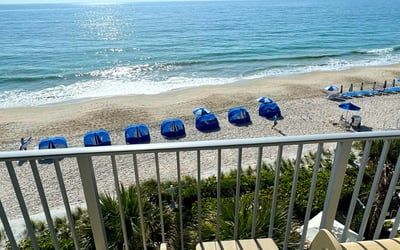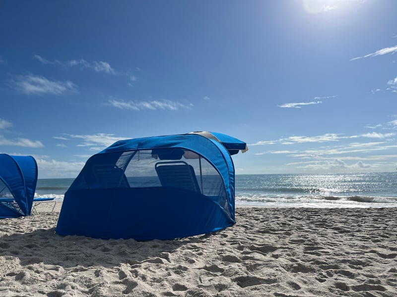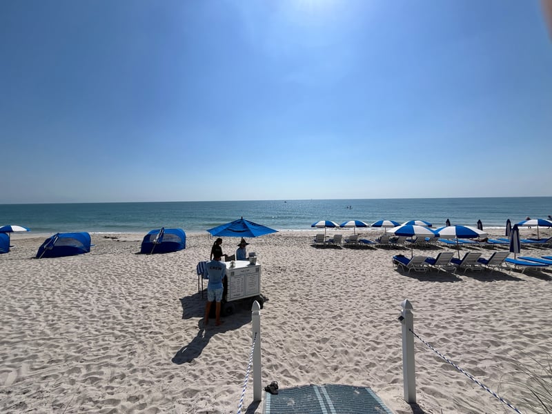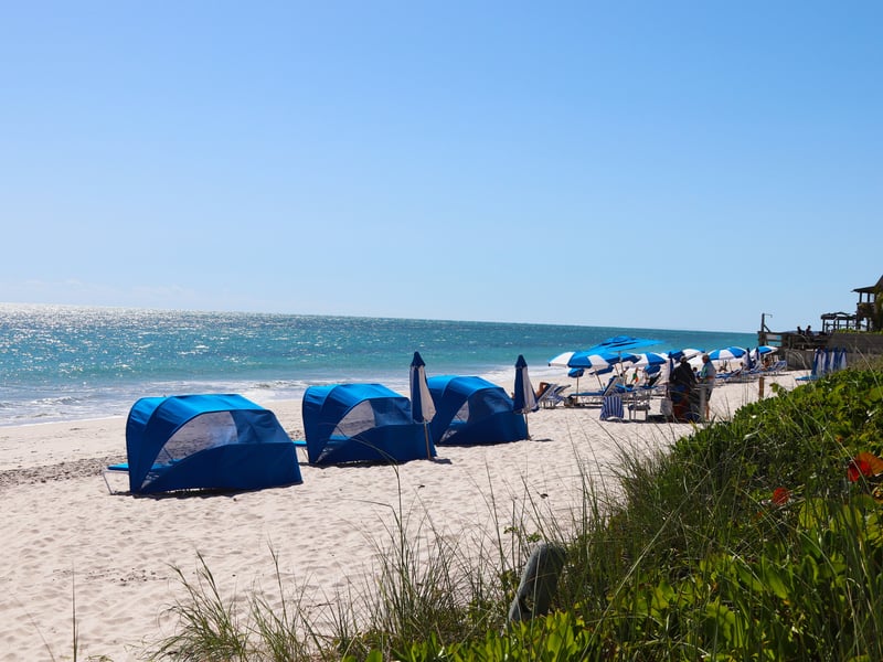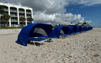 Enjoy a private cabana with chairs and umbrella for a full day of seaside relaxation