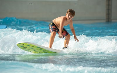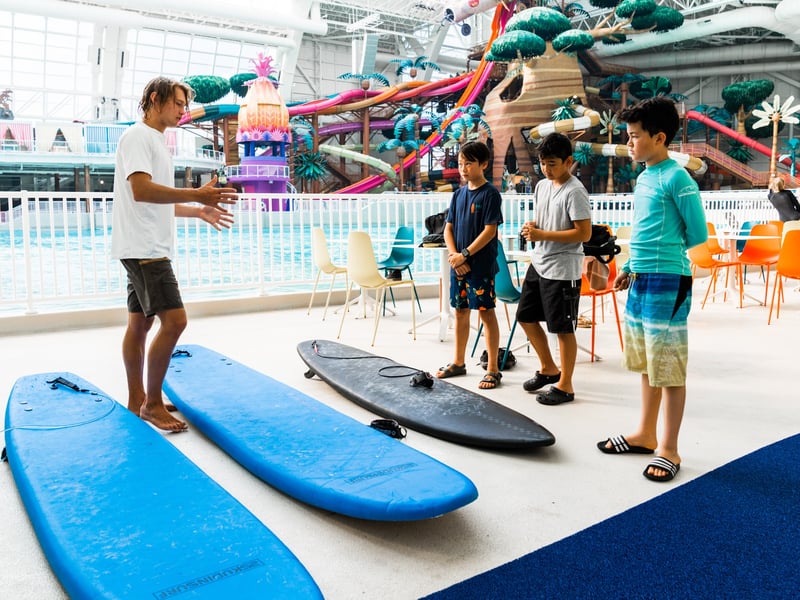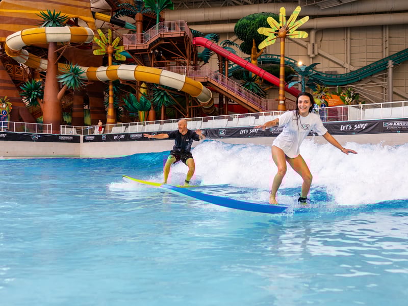 Start your surfing journey on the 2 ft "Gravy Train" wave with supportive group instruction. Choose a 1 or 2 hour session that includes a 15‑minute land lesson and foam boards.