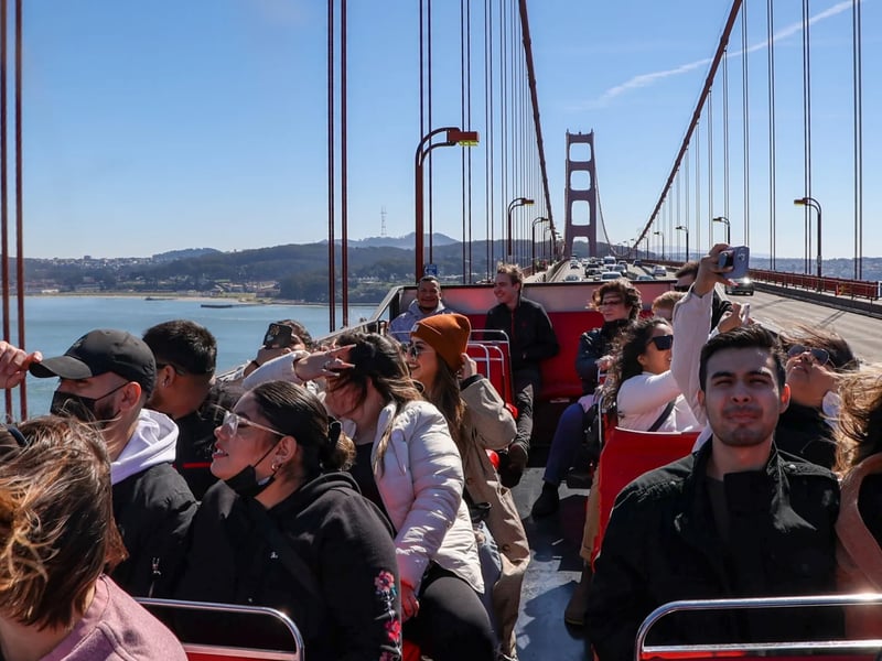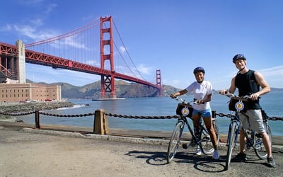 Cover top sights by bus, then ride across the Golden Gate Bridge on a full-day bike rental