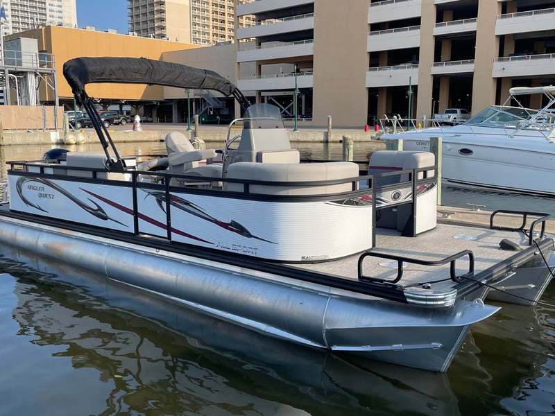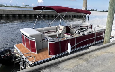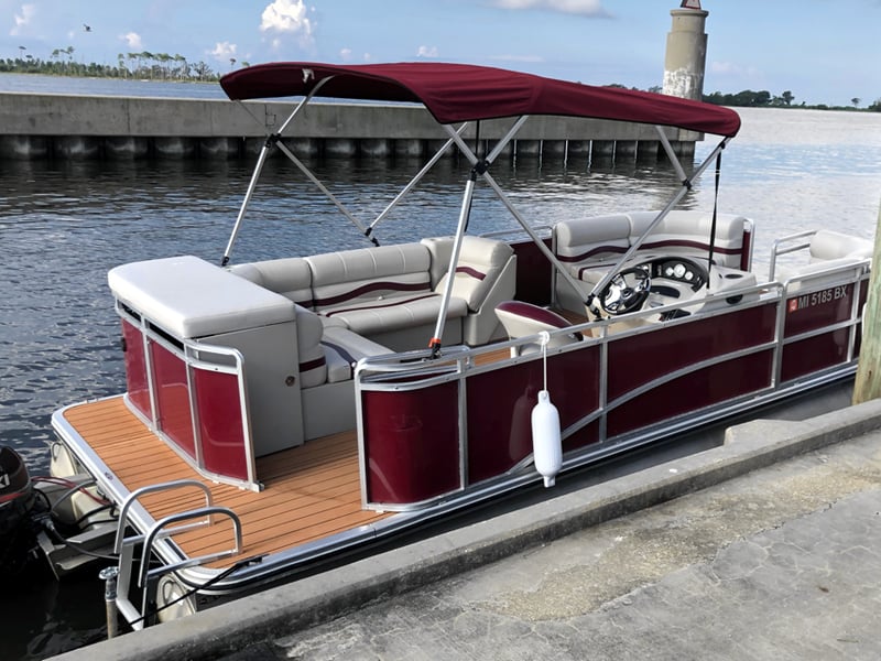 A traditional pontoon boat with comfortable seating and a bimini for shade.
