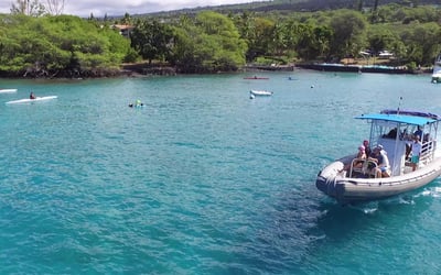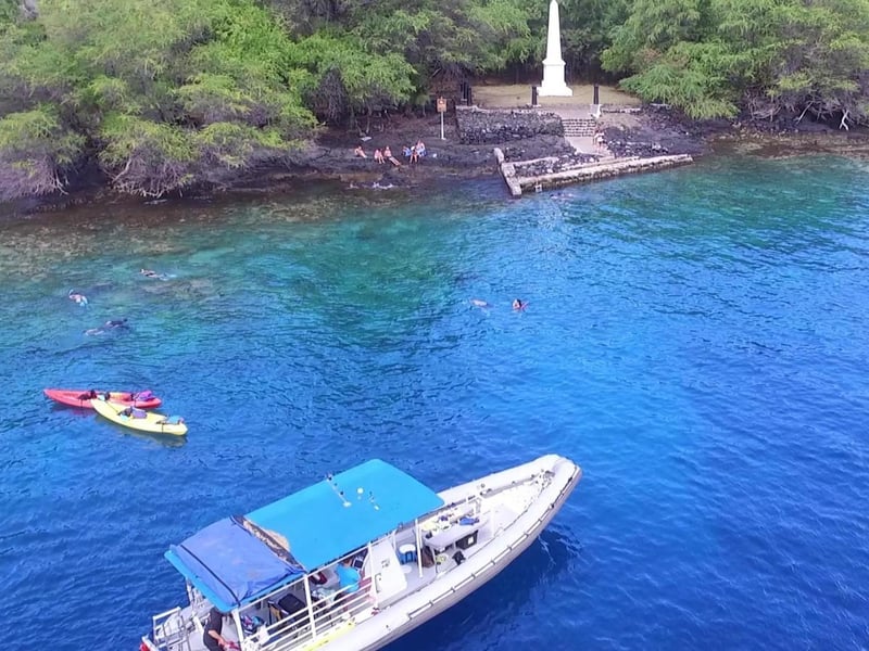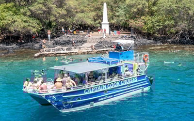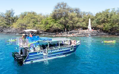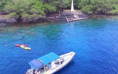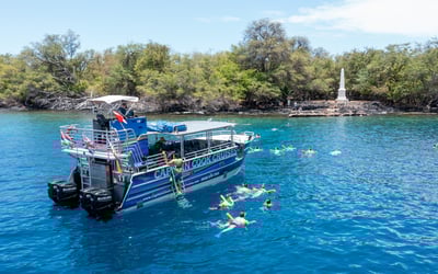 Set off from Kailua-Kona to snorkel the reefs of historic Kealakekua Bay near the Captain Cook Monument. Cruise the Kona coastline with views of sea caves and rugged volcanic landscapes, with over an hour of snorkeling time plus drinks, snacks, gear and floatation included.