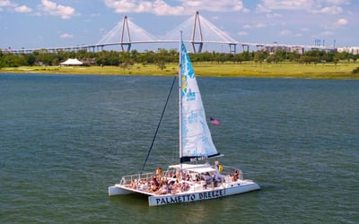 Step aboard the 55-foot catamaran Palmetto Breeze for a relaxed, social sunset sail on Charleston Harbor. Enjoy golden-hour skyline views, upbeat music, and a card-only bar as you cruise past landmarks and watch for dolphins.