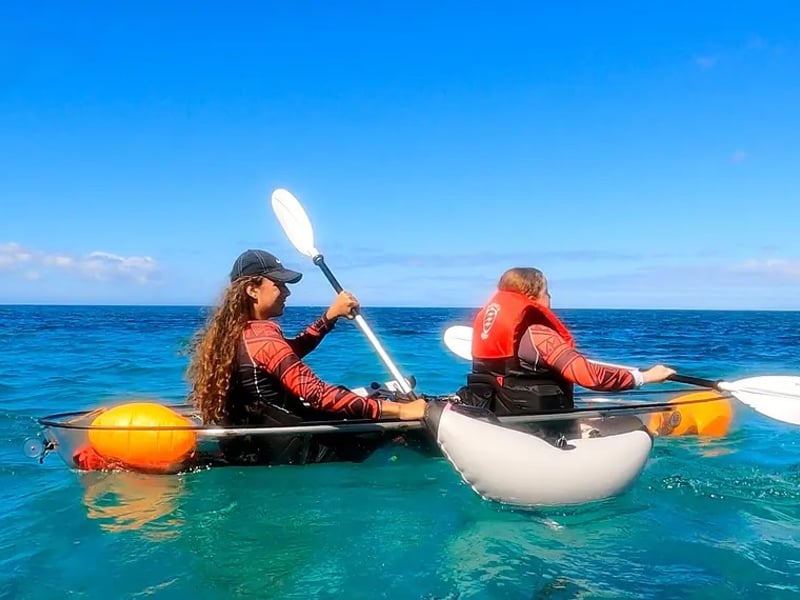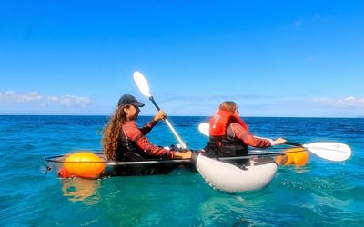 Glide over reefs in stable clear kayaks with a guide; family-friendly and educational