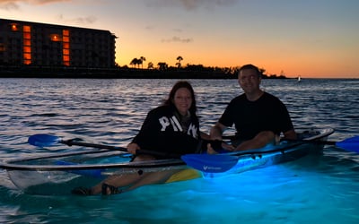 Clear tandem kayaks are fitted for two adults. The weight limit is 400 pounds per boat and no more than 225 pounds per seat. Please arrive 15 minutes prior to departure for a mandatory safety overview.
