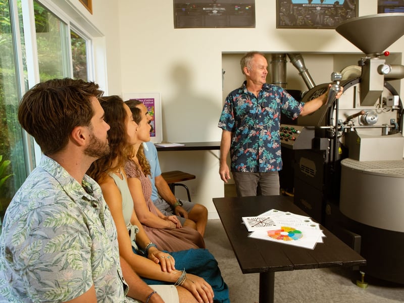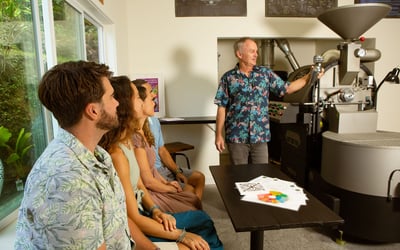 Discover Kona coffee's journey from bean to brew as you roast two batches alongside a master roaster. Gain hands-on insight into how processing and roast levels shape flavor.