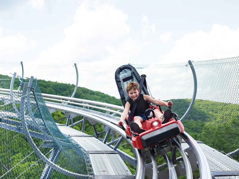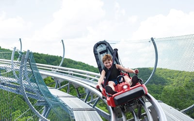 Race through the Ozark Mountains on a nearly mile-long alpine track, carving loops, drops and curves aboard the Copperhead Mountain Coaster. Choose day or illuminated night runs and control your own speed on the advanced braking system.
