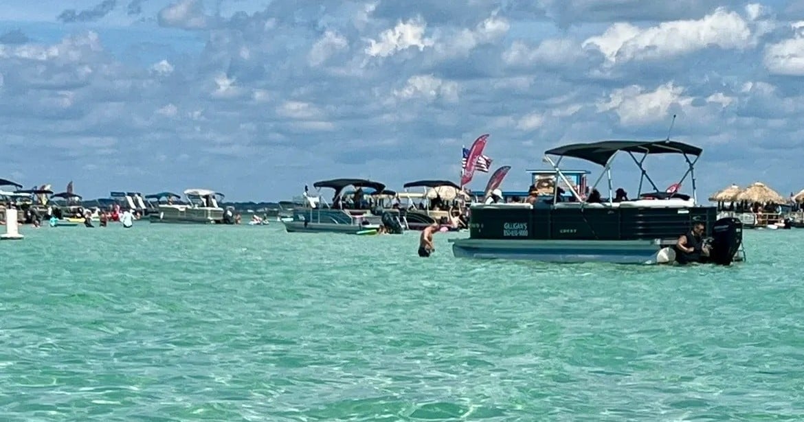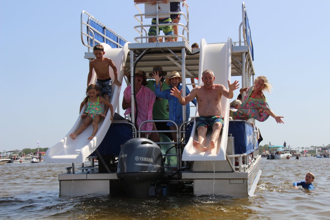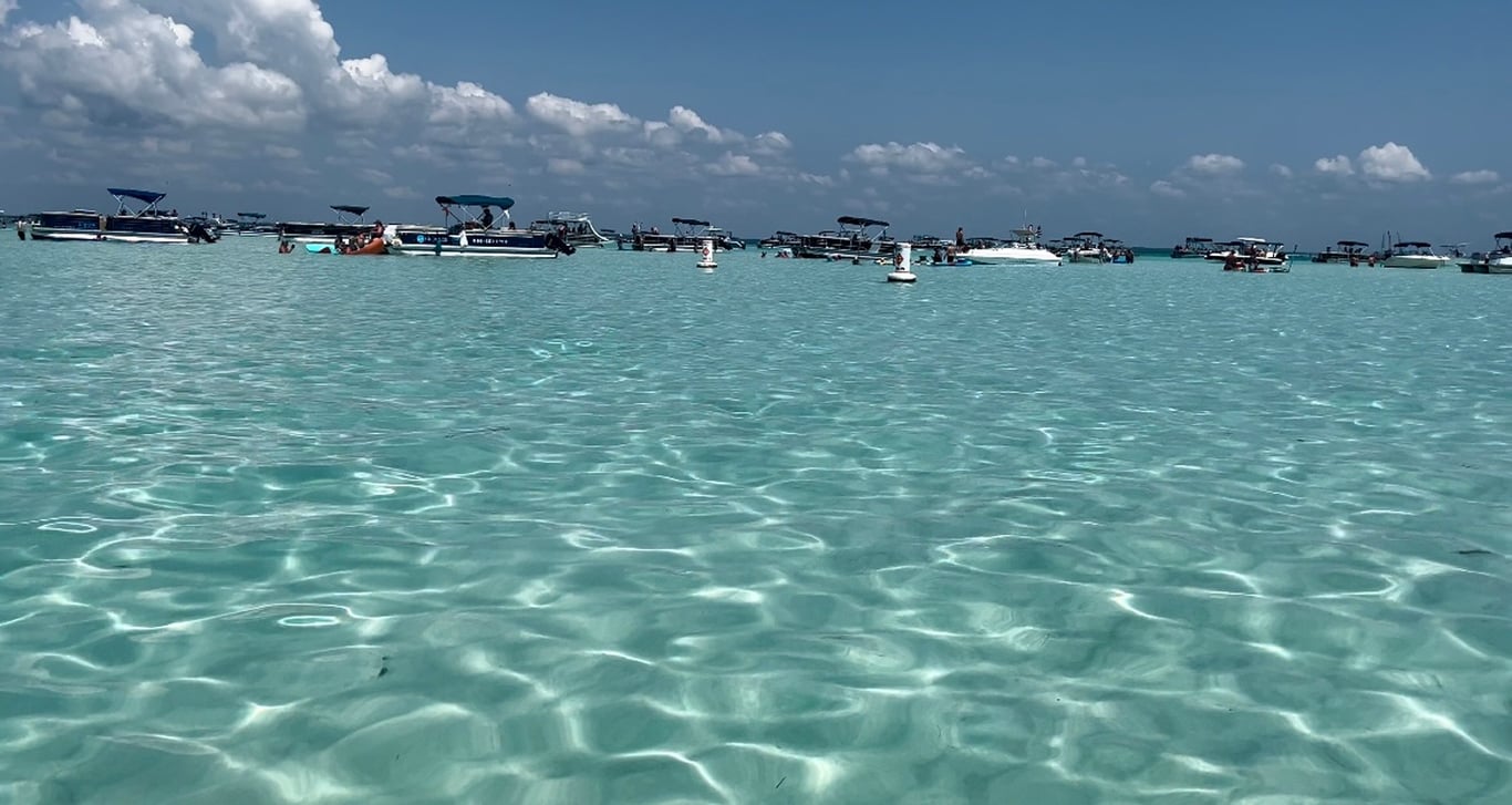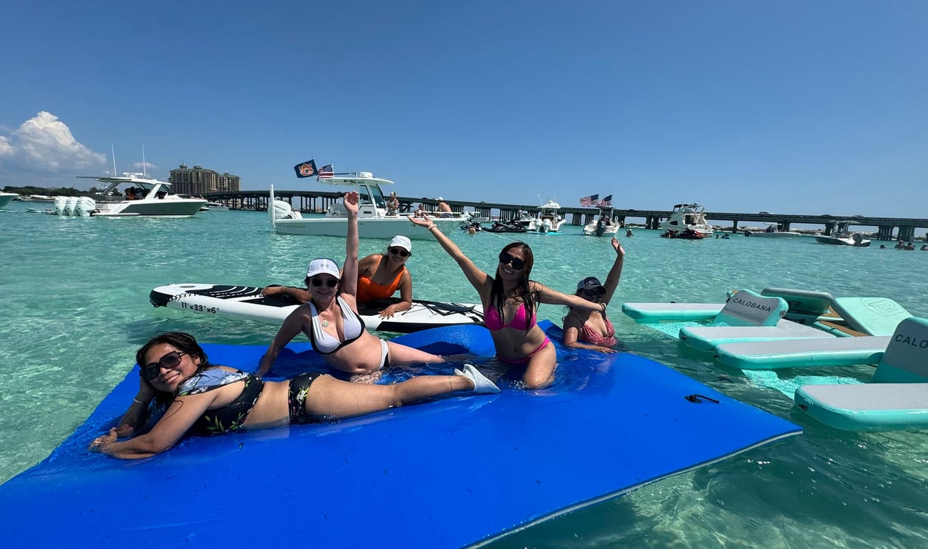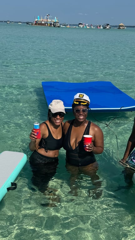 Cruise through historic Destin Harbor to Crab Island, a shallow sandbar with clear emerald water. Your USCG licensed captain anchors and sets up floating gear so you can relax, swim, and enjoy your music.
