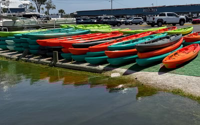 Arrive 30 minutes early for a required FWC video and waivers; time on the water starts at your booking time. Minimum ages: 12+ for single kayaks and standard paddleboards; tandem allows ages 3+ with one adult 18+ required. Weight limits: single kayak 325 lb, tandem 525 lb, standard paddleboard 250 lb, hybrid 350 lb. A marina launch fee and parking fee apply at Pete's Pier Marina.