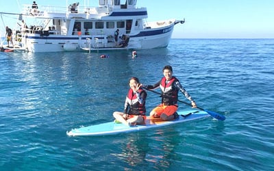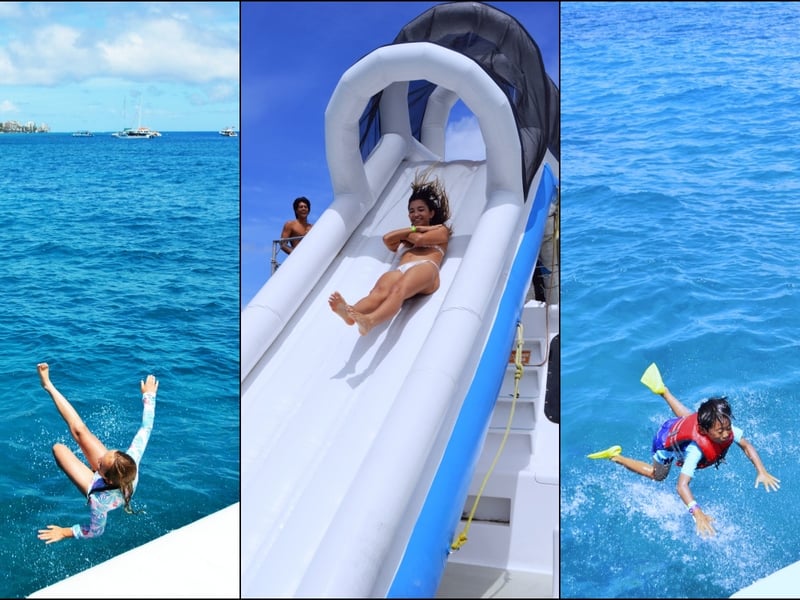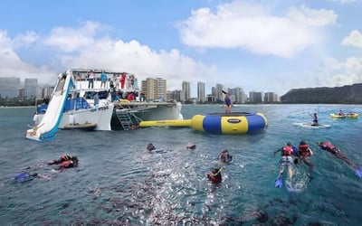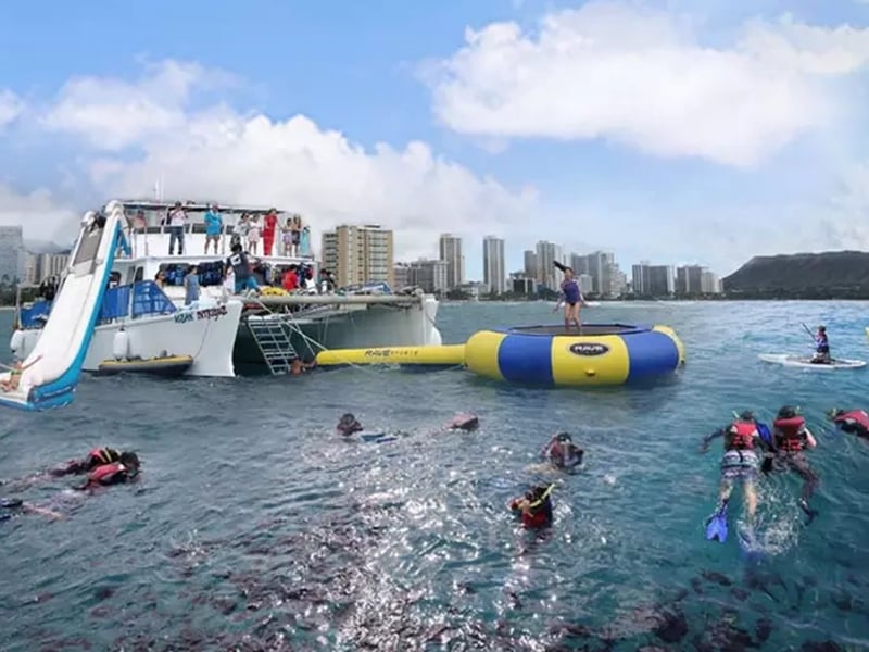 Enjoy snorkeling with turtles plus waterslide, trampoline, paddleboards, and kayaks on a 3-hour Waikiki cruise