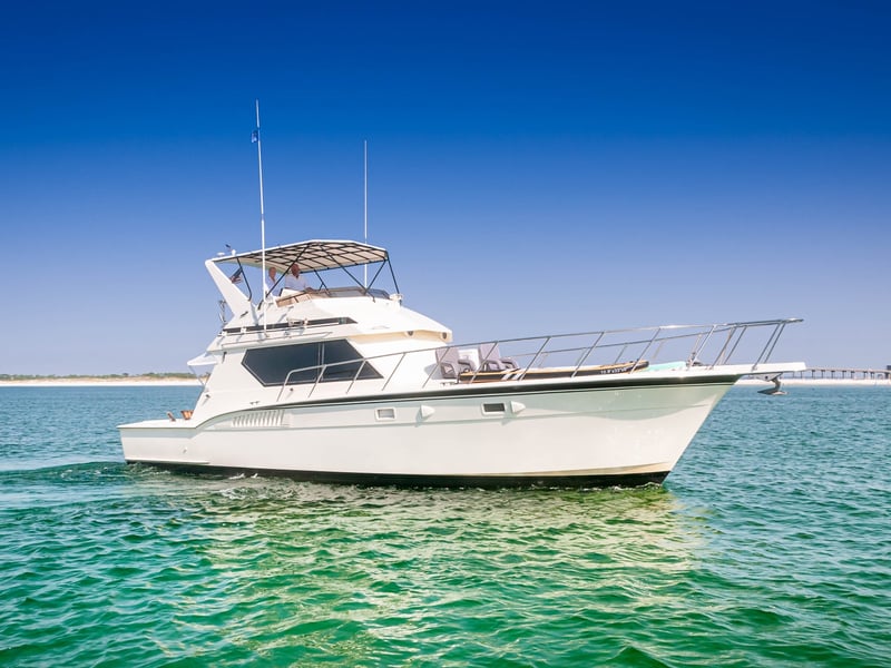 Cruise emerald waters aboard a 45' Hatteras yacht, swim and spot dolphins with up to 12 guests