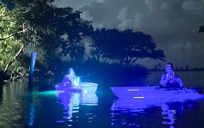 Slip into crystal-clear tandem kayaks lit by LEDs and paddle after dark to Pirates Cove in Mary Esther. Hear haunting legends as you explore calm waters and uninhabited islands under the night sky.