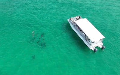Spot playful dolphins on Destin’s emerald waters aboard a Coast Guard certified catamaran