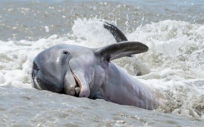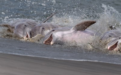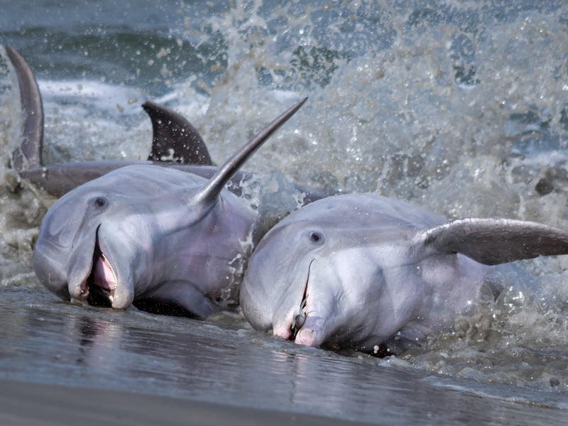 See dolphins work together to strand-feed along the banks on a low-tide expedition
