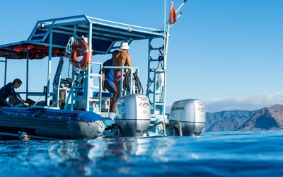 Rent the Dolphin Warrior for a private ocean safari tailored to your group. Choose a 2-hour dolphin watch or a 3-hour dolphin swim, with snorkel gear included on the swim option.