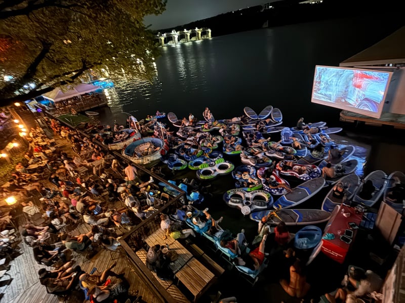 Relax dockside on a donut boat with VIP movie views and easy access to snacks and restrooms
