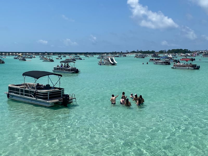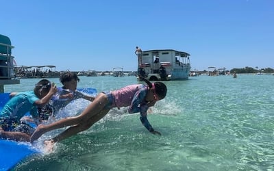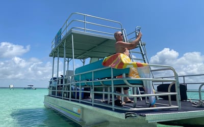 Head out on a spacious double-decker party barge with a full upper deck and a built-in water slide. Relax, socialize, and enjoy panoramic views as you drift and splash around Crab Island.