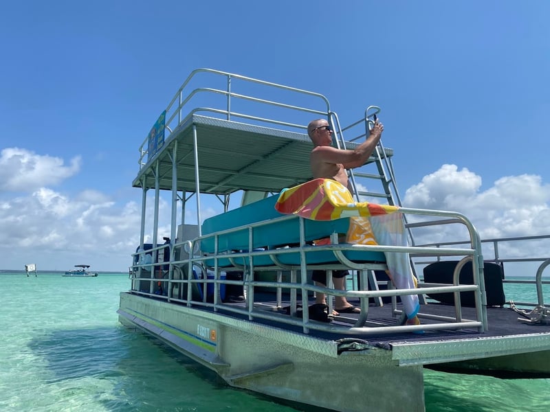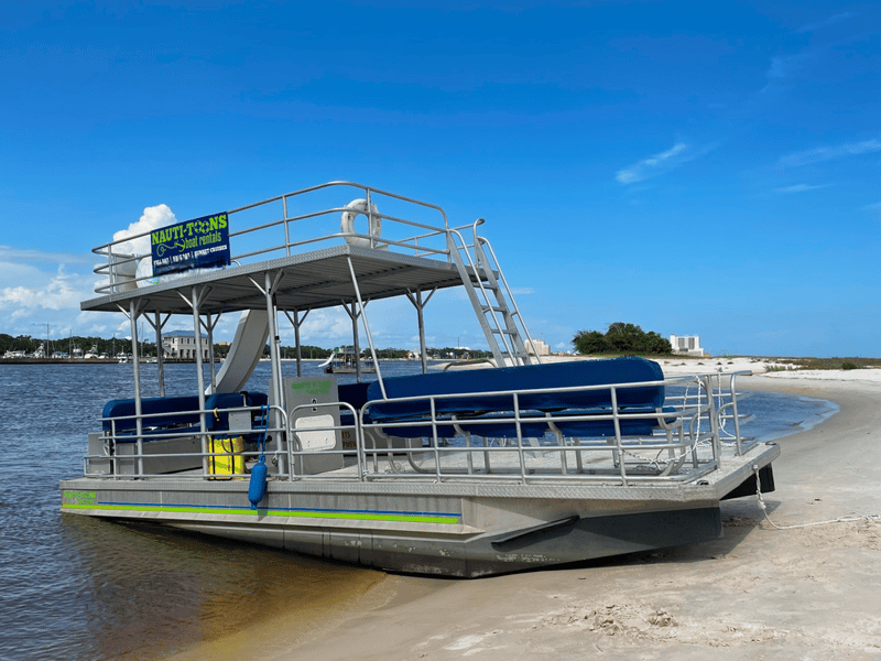 Relax on a spacious two-level barge with a built-in slide for a fun day at Crab Island