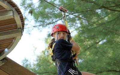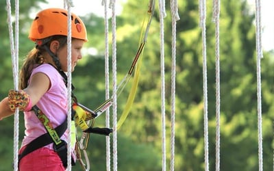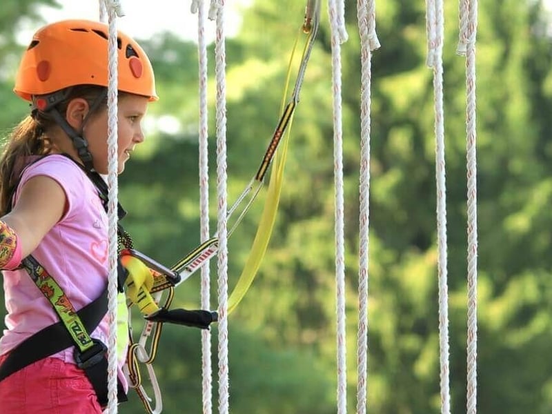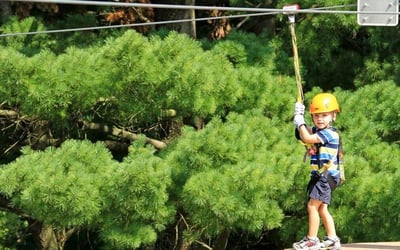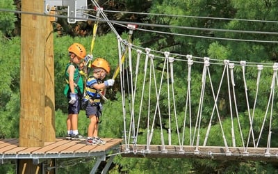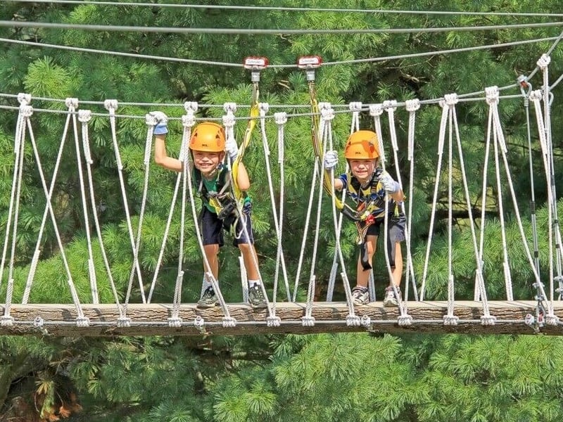 Let kids soar on eight ziplines with bridges and a sky tunnel, using a continuous-belay safety system