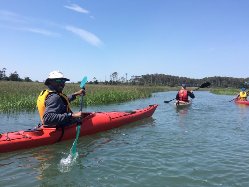 Beginner-friendly paddle through marshes to Racoon Island to spot coastal wildlife
