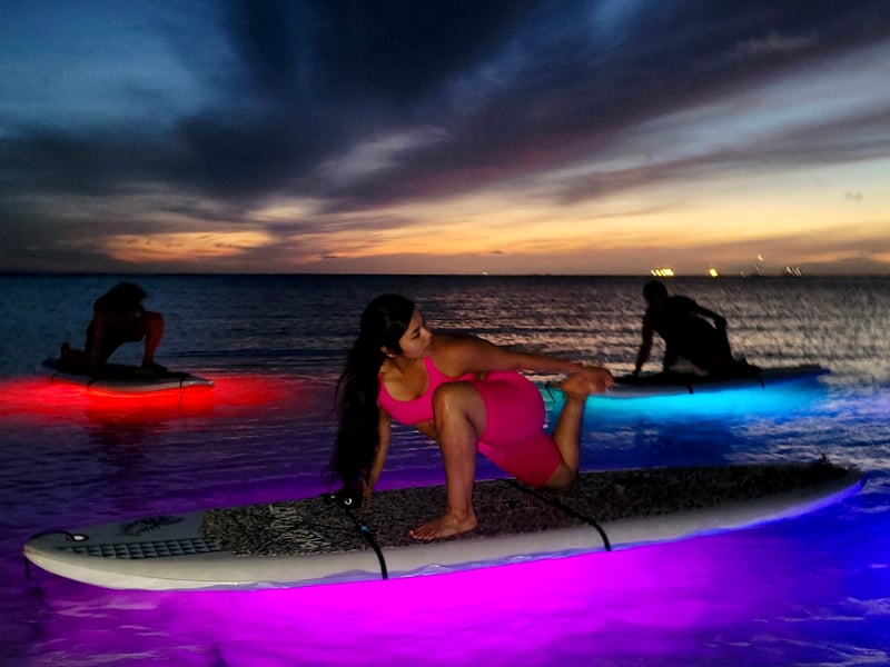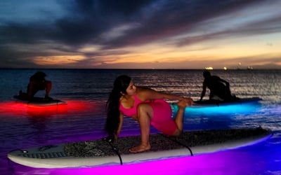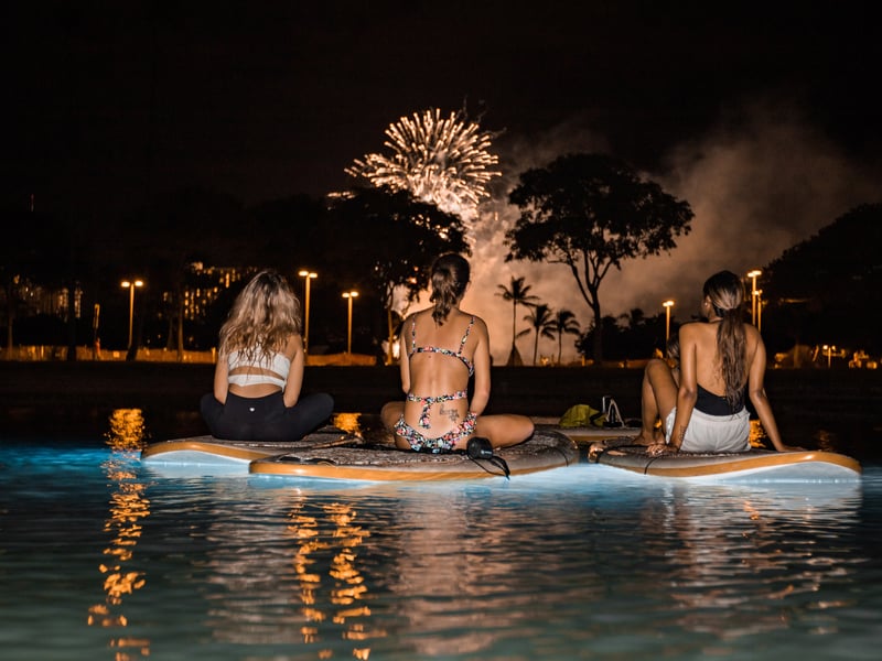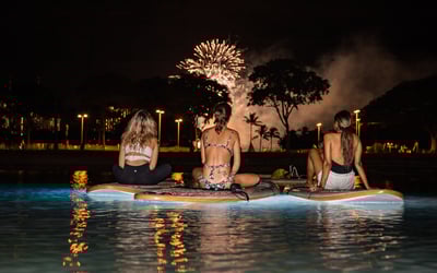 Experience an evening floating yoga class illuminated by LED lights as Honolulu shifts from dusk to night. Close your practice with a peaceful meditation and watch a fireworks show from the water.