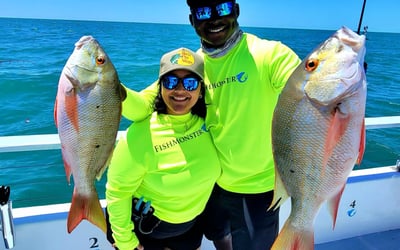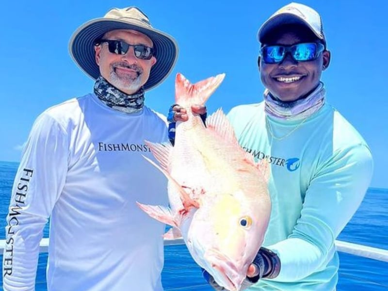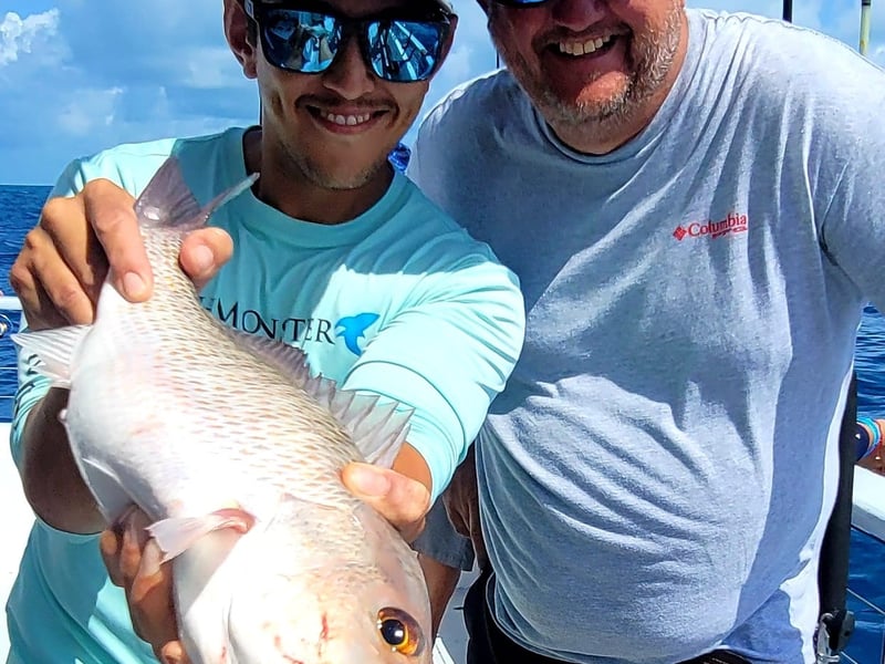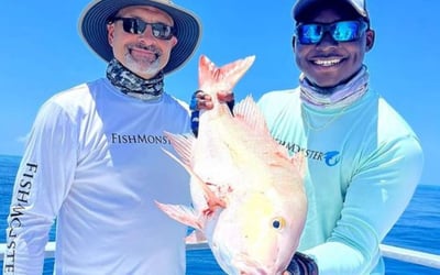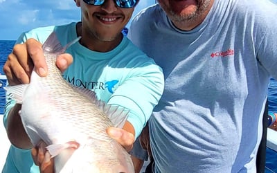 Reef fishing aboard a spacious vessel with AC galley and restrooms, ideal for families, friends, or corporate groups