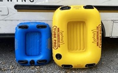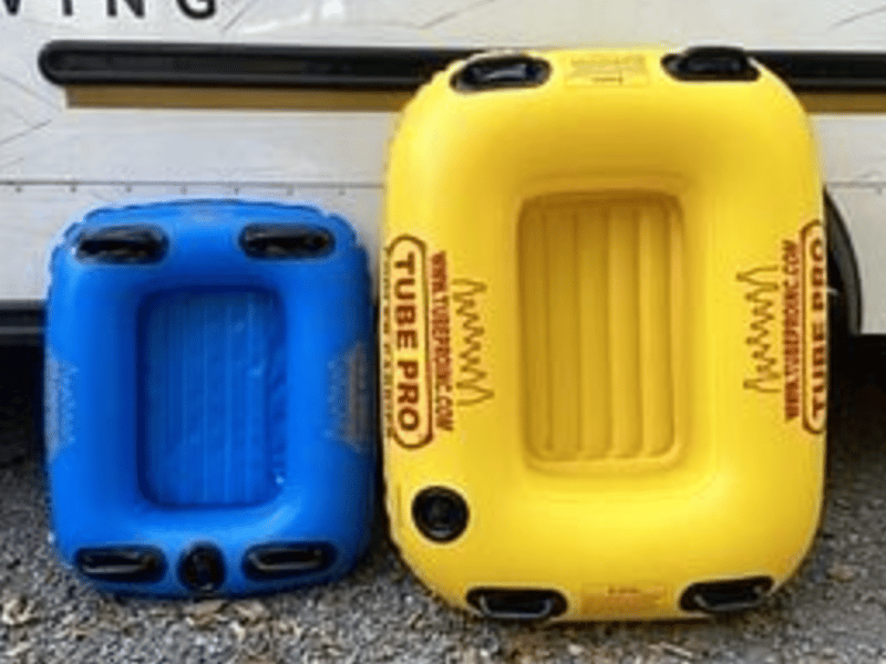 Wear your PFD, grab your tube, and float on your back with feet downstream through rapids until calm water. Do not stand up in moving current.